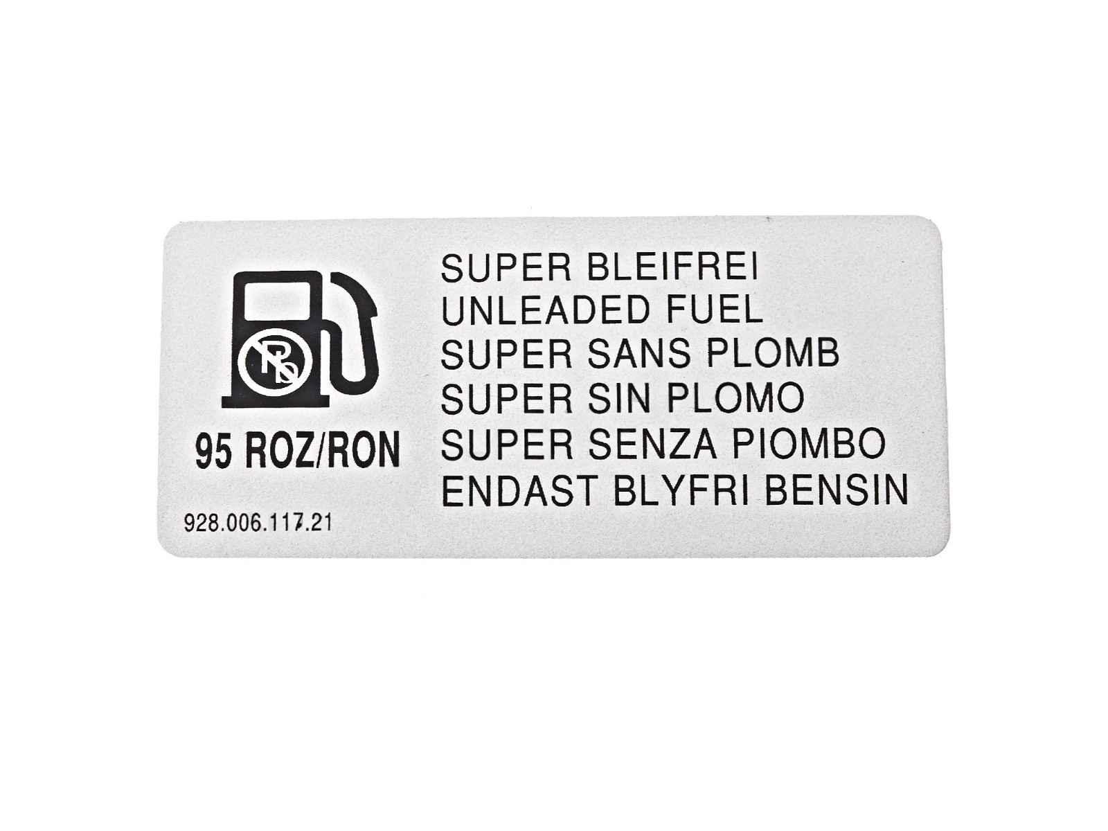 This fuel octane sticker provides a clear indication of the required fuel type for your Porsche.