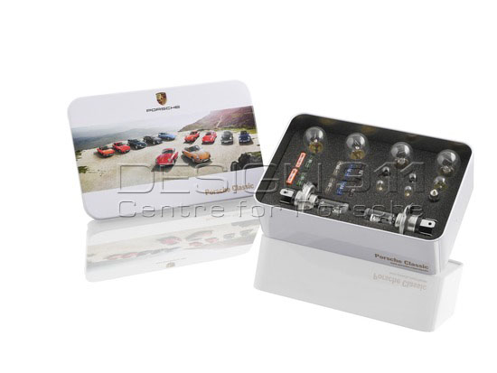 The packaging comprises a white Porsche Classic designer metal box with foam inserts.