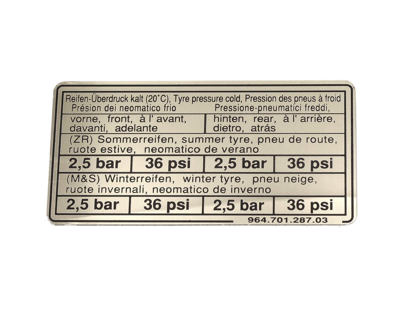 Tyre decals are essential identification and information labels fitted to Porsche vehicles, displaying recommended tyre pressures, sizes, and specifications. These decals play an important role in ensuring correct tyre maintenance and performance while contributing to the authentic presentation of your Porsche’s interior, luggage compartment, or door jamb. Whether restoring a classic model or maintaining a modern one, a clear and accurate tyre decal is both functional and visually important.