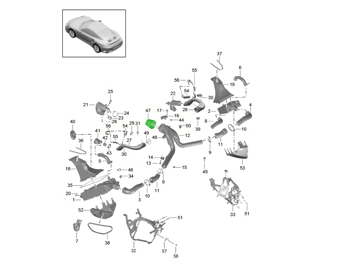 Air inlet hoses, pipes, and sleeves are essential components of your Porsche’s intake system, connecting the air filter housing, throttle body, turbocharger, and intercooler. They ensure a smooth and sealed flow of air into the engine, supporting efficient combustion, responsive acceleration, and consistent performance.
