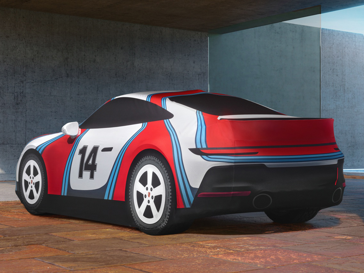 Perfect-fit indoor vehicle cover in the style of the Rally Design package for the 911 Dakar. The cover made from breathable, antistatic and dirt-resistant material references the legendary winner of the Dakar Rally in 1984: the 911 Carrera 3.2 4x4 Paris-Dakar (953).