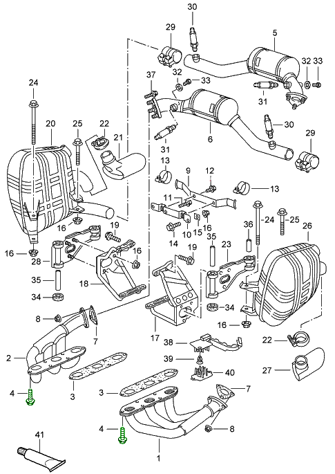 Contains all necessary gaskets, clamps, sleeves, nuts, bolts and washers. Ideal when you change the whole exhaust system on your Porsche 996 - manifolds, catalytic converters and silencers at the same time.