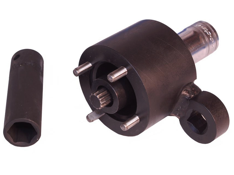 STOMSKI RACING's version of this tool works on both the intake and the exhaust cams on the Cup engines and on all non-vario cams for the other GT3-type engines. This tool replaces the factory tool P9653/1. Moreover, additional refinements of this tool ensures that while torquing either the 16mm hex or the triple-box cam sprocket bolts, your tool is securely bushed and supported in the center of the tool, and thus will not slip off or round off the bolts. Black oxide finished hardened steel.