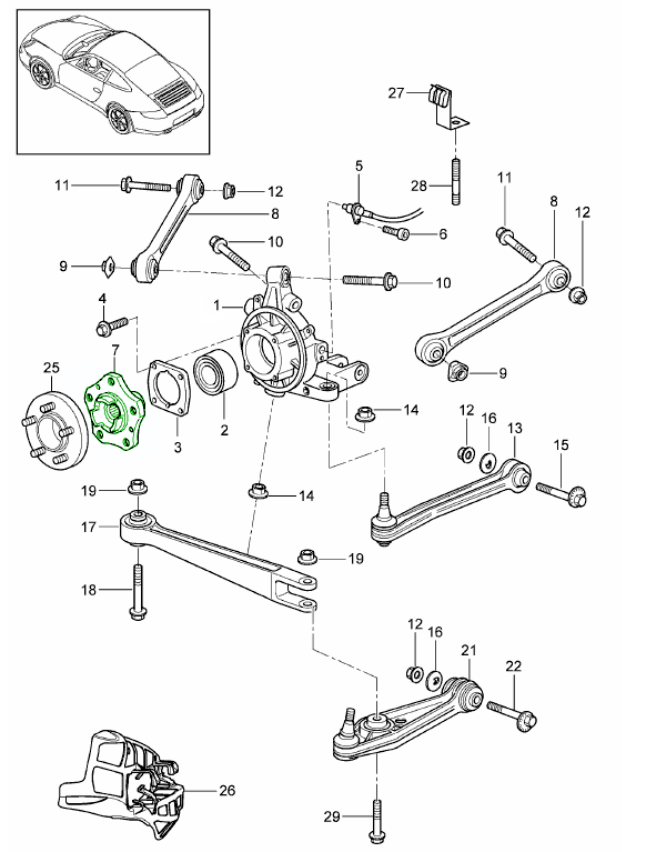 The wheel hub and wheel carrier are essential components in your Porsche’s suspension and axle system. Together, they form the central mounting point for the wheel, brake disc, and bearing assembly, allowing smooth rotation and precise alignment. The wheel carrier (or knuckle) connects to the suspension arms and steering system, maintaining exact geometry for stability, safety, and control.