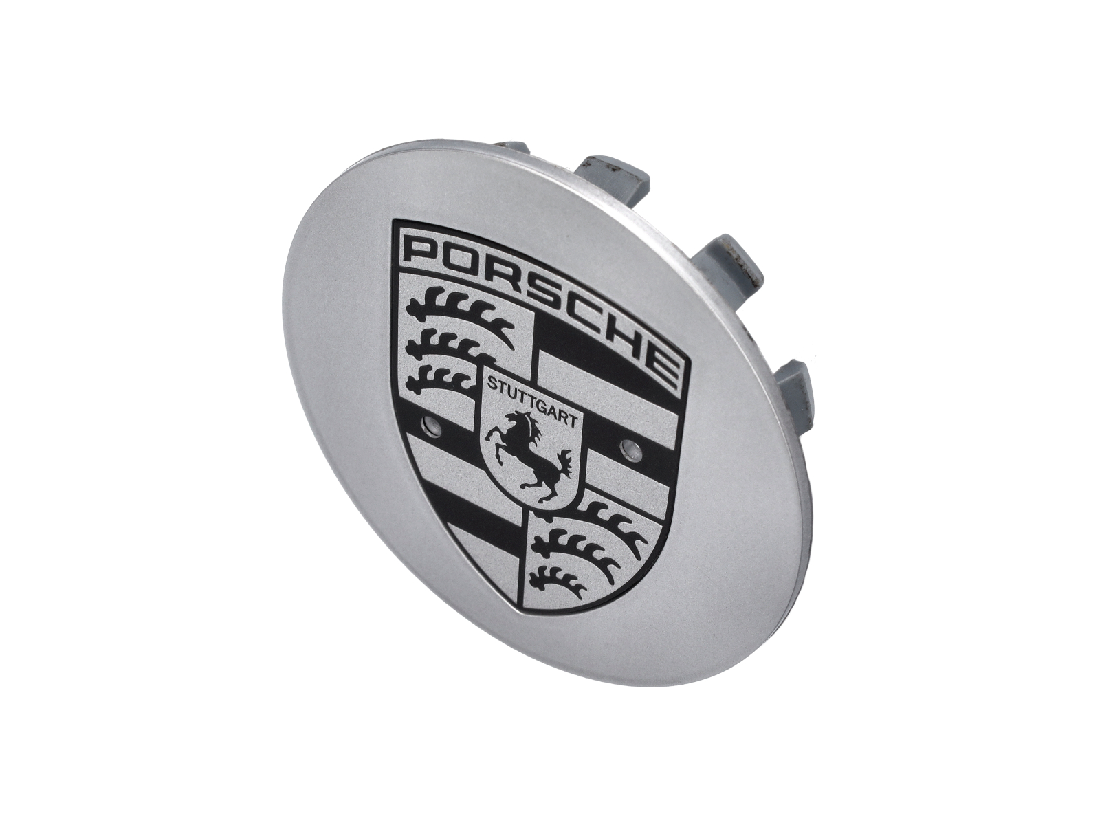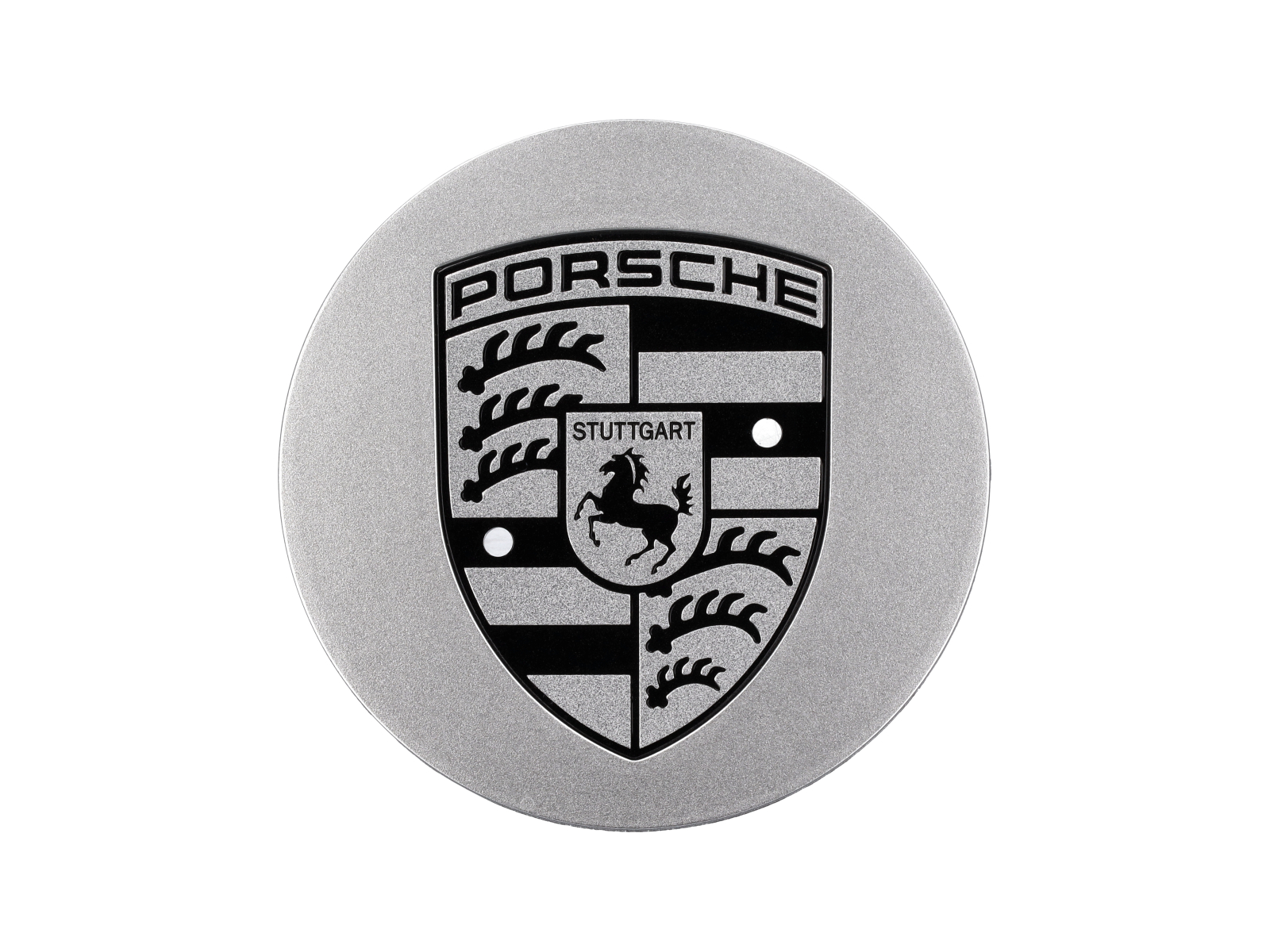 Wheel cap in silver with black Porsche crest. Round, Convex.