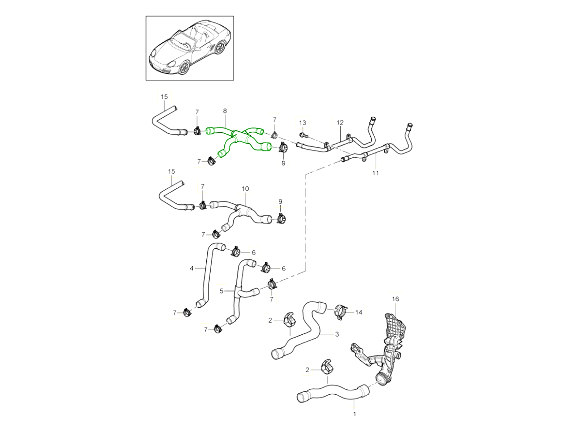 Coolant hoses in the engine bay are critical components that circulate coolant between the radiator, water pump, and engine block — maintaining consistent operating temperatures and preventing overheating. These hoses carry coolant through high-pressure, high-temperature zones within the engine bay, ensuring your Porsche performs at its best, even under demanding conditions.
