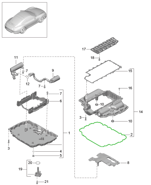 The engine oil sump, also known as the oil pan, is a vital component of your Porsche’s lubrication system. It serves as the main reservoir where engine oil is stored, collected, and circulated. The sump ensures that oil is continuously supplied to all critical moving components, maintaining cooling, lubrication, and engine longevity — especially during high-performance driving.
