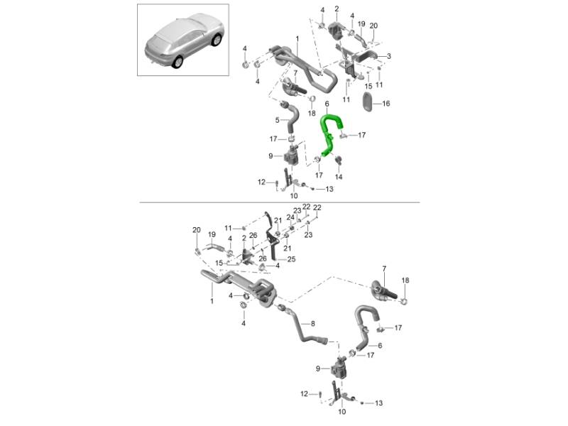 The Heating Hose Return Line – Coolant Pump to Engine is a genuine Porsche cooling and heating system component designed to return coolant from the auxiliary coolant pump back into the engine. This hose ensures consistent coolant circulation through both the engine cooling circuit and the vehicle’s heating system.