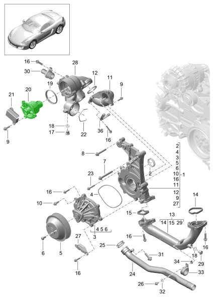 带两个 O 形圈的恒温器恒温器外壳位于发动机顶部,水泵后方。