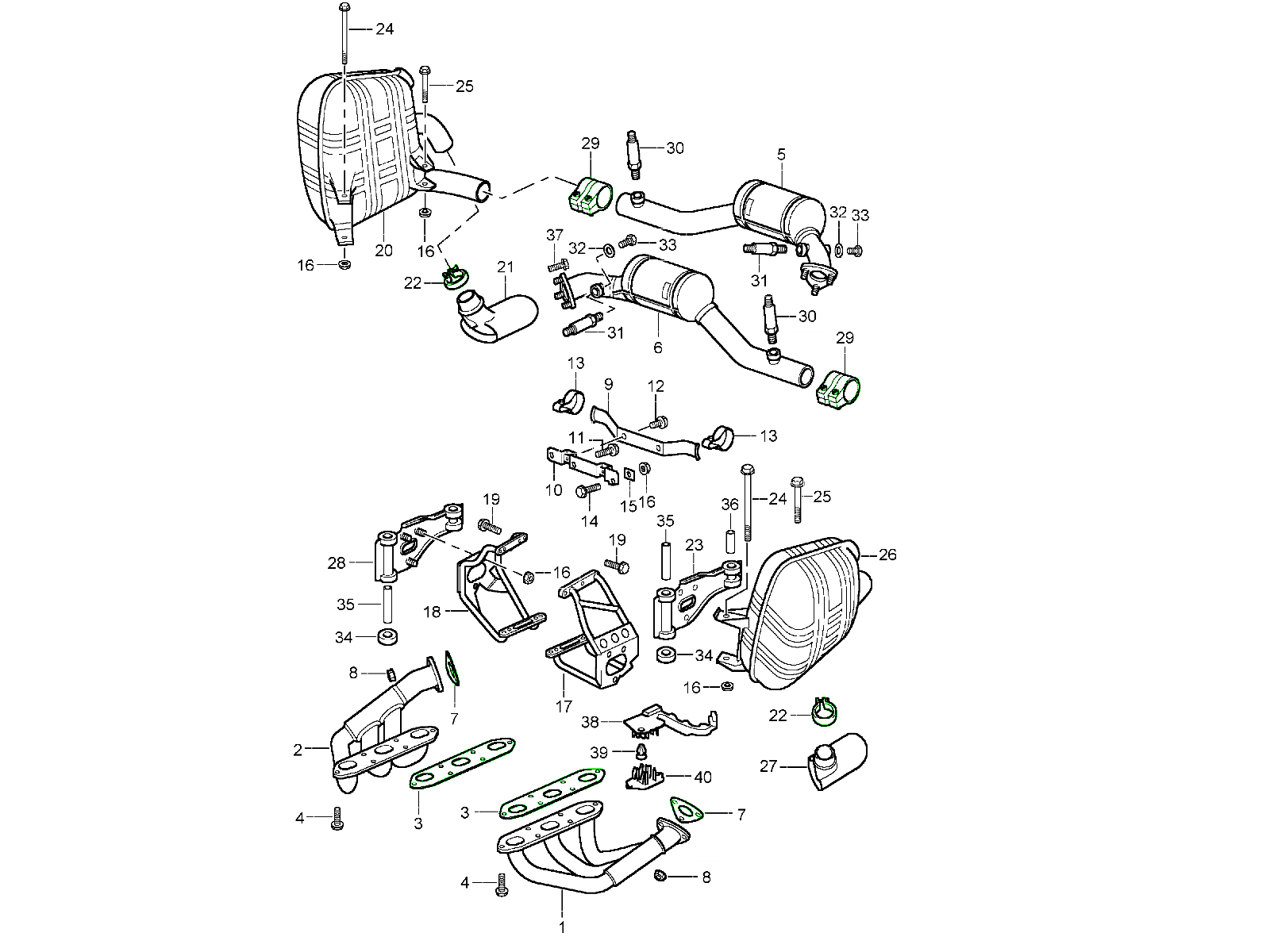 包含所有必要的垫片、钛合金卡箍、套筒、螺母、螺栓和垫圈。是更换保时捷 996 整套排气系统(包括歧管、催化转化器和消音器)的理想之选。