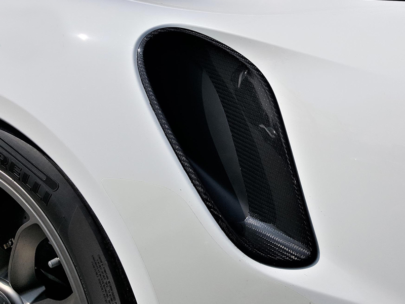 注意:带有 NACA 管道的碳纤维前引擎盖由保时捷工厂设计,用于 991 GT3 RS 和 991.2 GT3 RS,用于通过空气通道将空气吹向前制动器以达到冷却目的。对于所有其他未配备用于冷却制动器的空气通道的 991 / 981 / 718 型号,可以订购带有关闭的 NACA 通风口的前引擎盖。