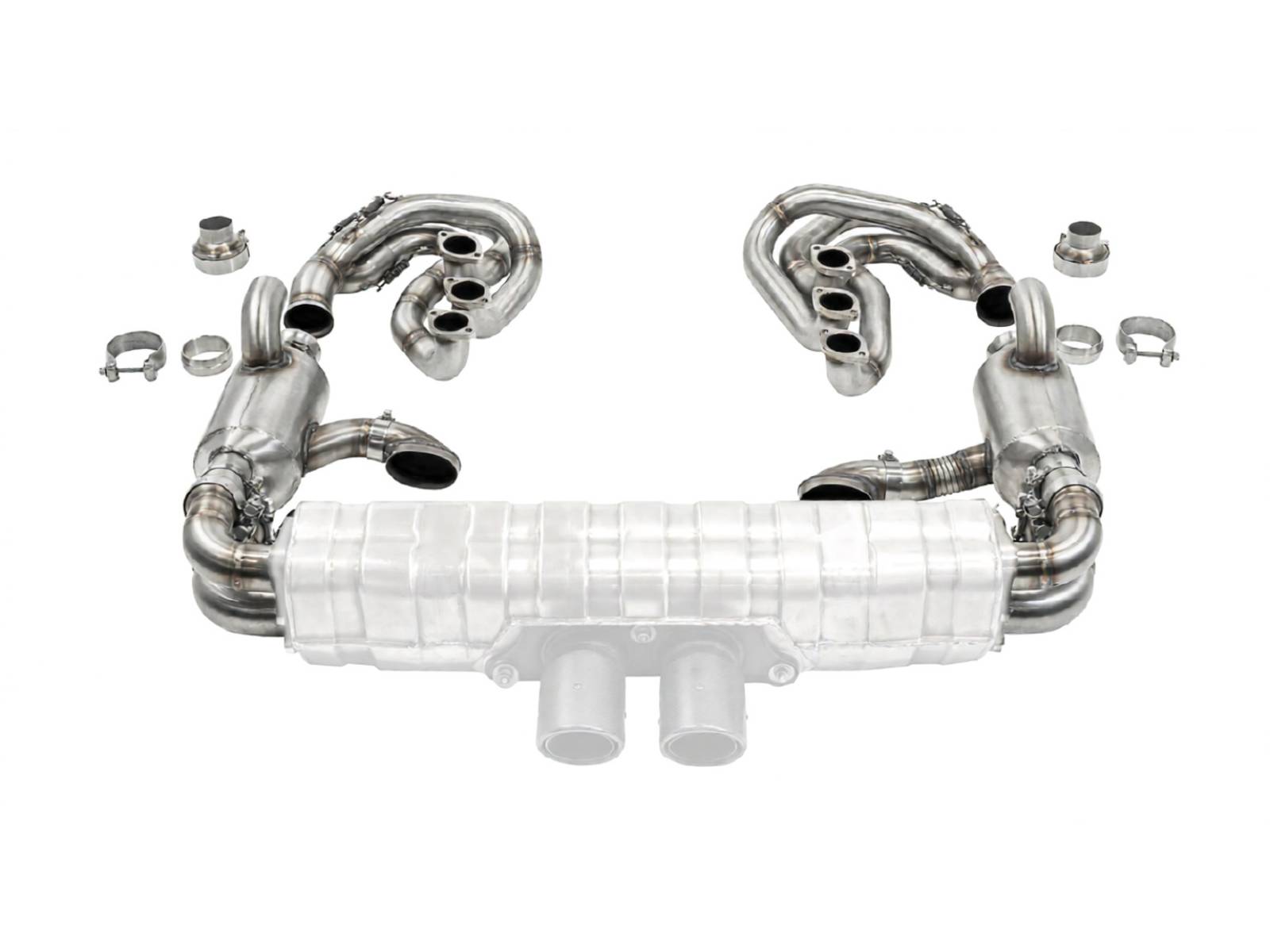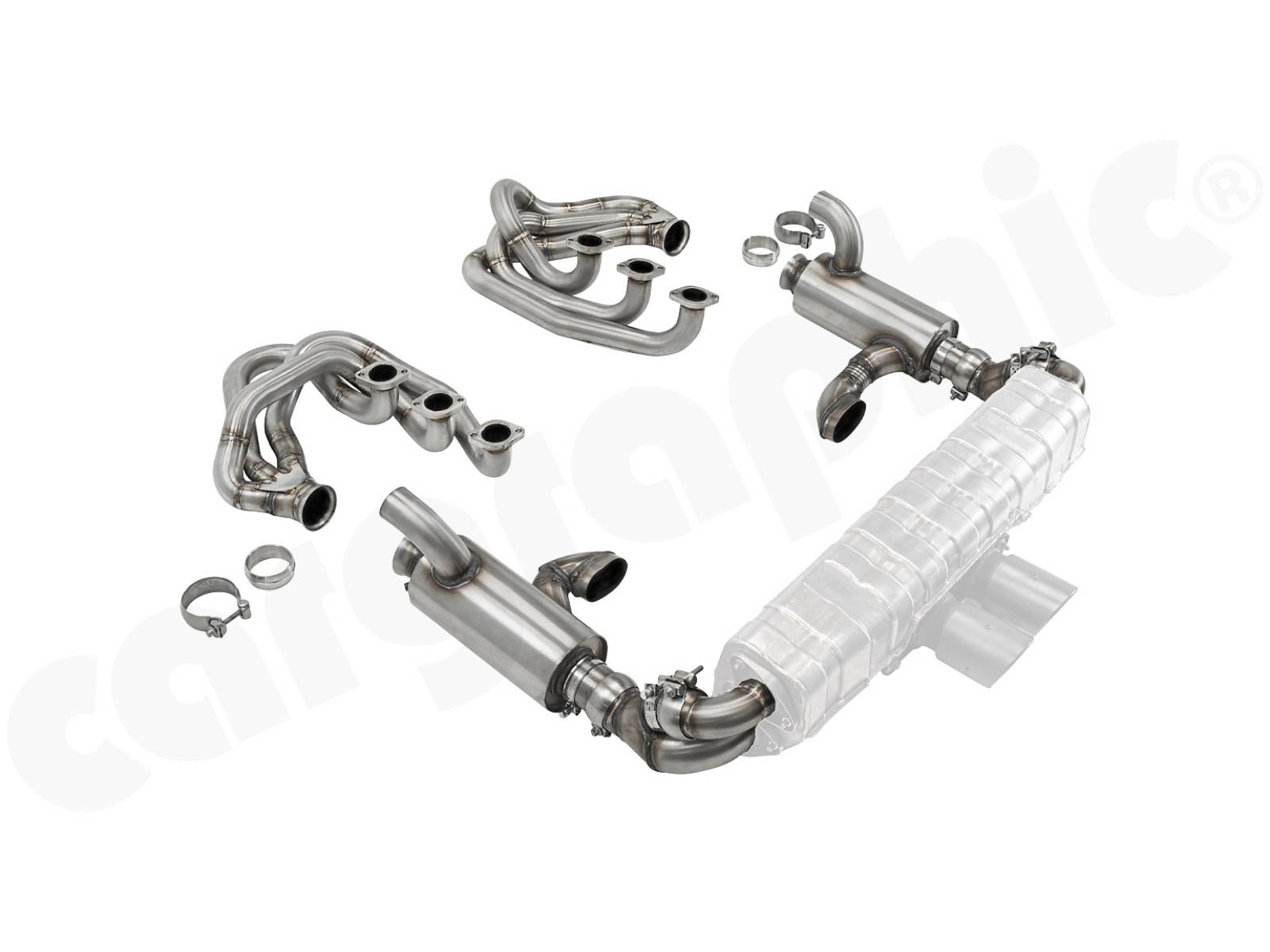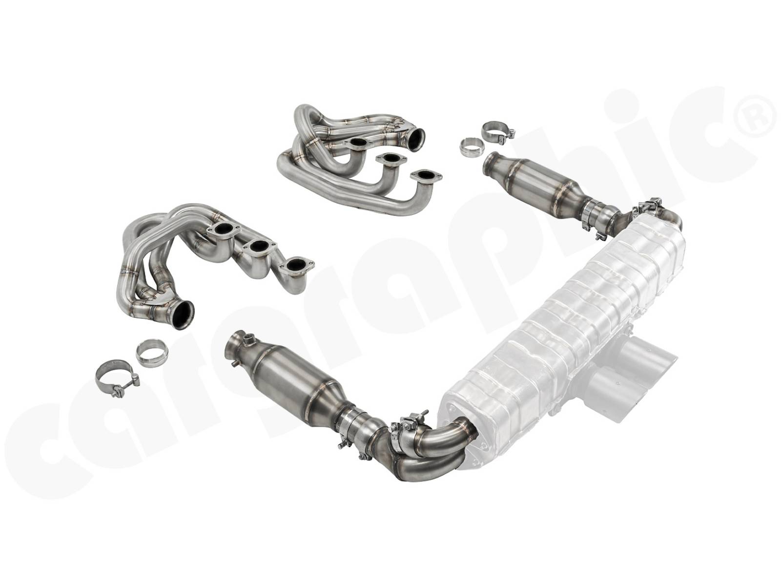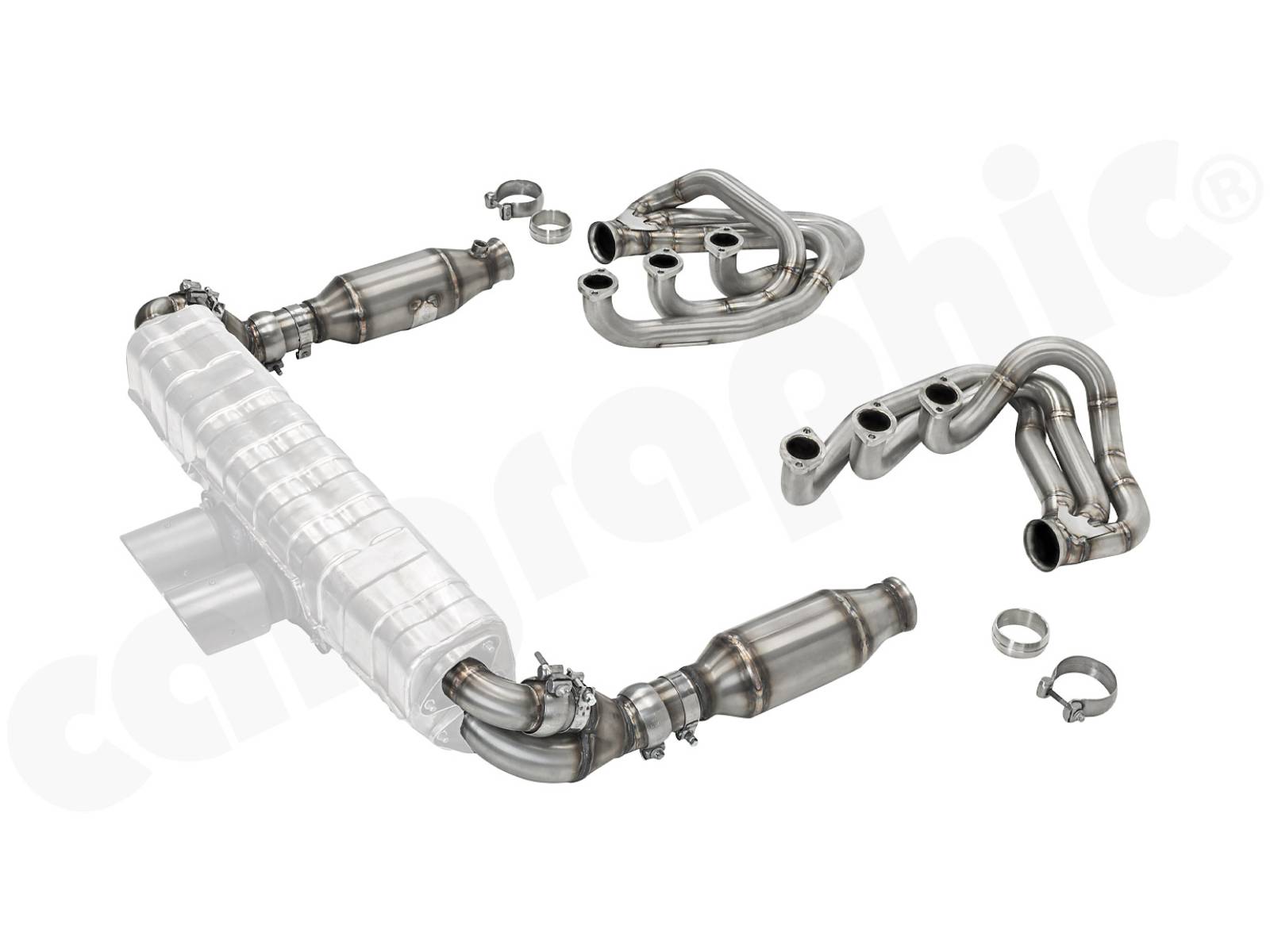 CARGRAPHIC GT Sport 排气系统,配备 ID45 GT 歧管套件,带/不带2x200cpsi 催化转化器,带加热功能,可与 OEM GT3 后消音器配合使用。