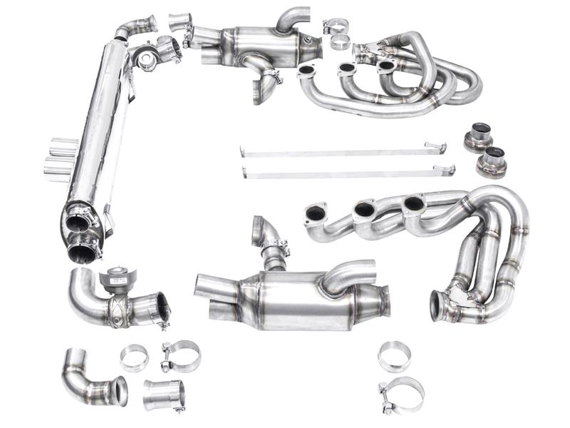 CARGRAPHIC GT Sport 排气系统,配备 ID42 GT 歧管套件,带/不带2x200cpsi 催化转化器,带加热阀和排气阀 - 可与 OEM GT3 后消音器配合使用。