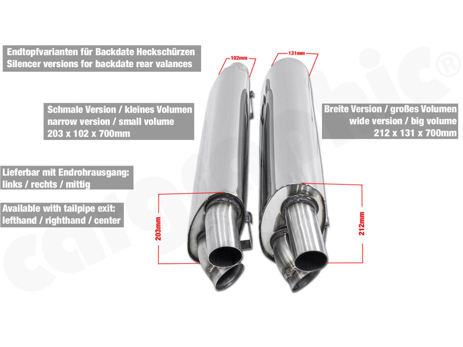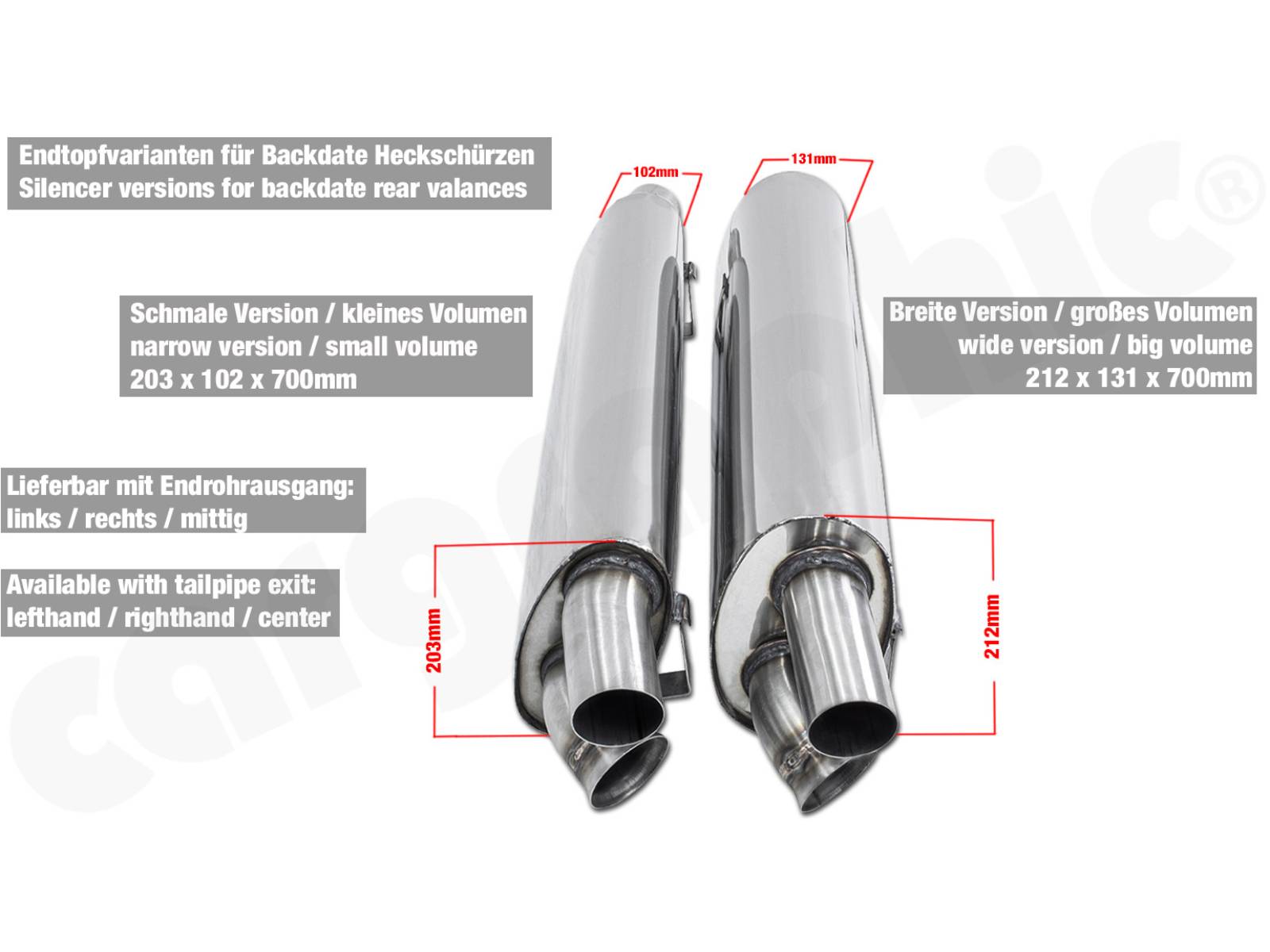 - 提供两种适用于复古风格后裙板的消音器版本。