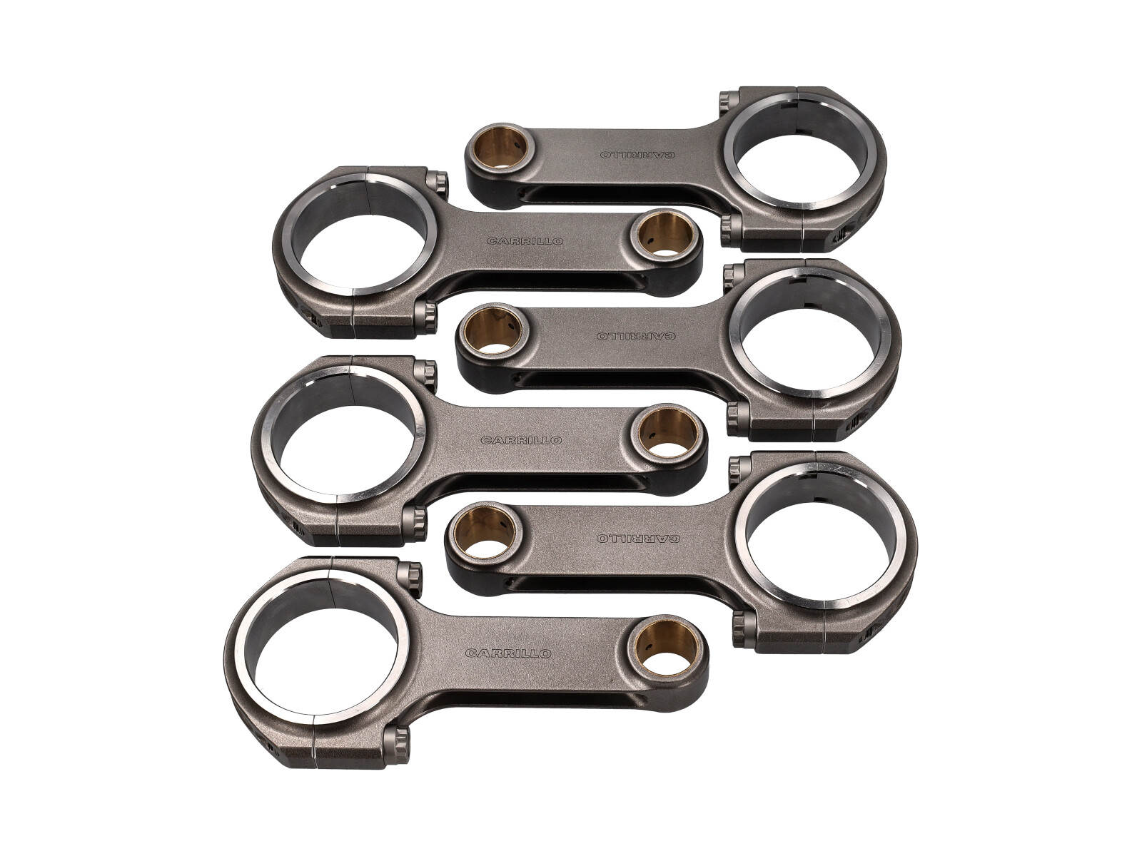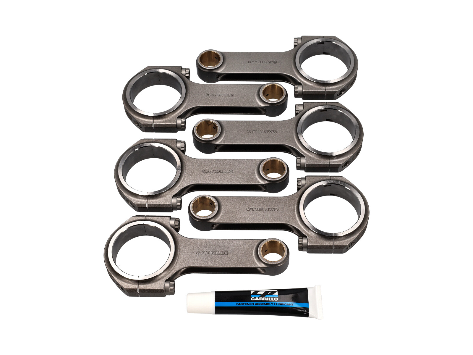 CP-Carrillo 连杆完全由专有的 4330m 合金锻件加工而成,具有强度和耐用性。连杆有两种螺栓可供选择:标准 WMC-H6 螺栓,UTS 为 220ksi,升级版 CARR-S6 螺栓,UTS 为 285ksi。如果计划将发动机转速提高到 8500rpm 以上,升级版 CARR 螺栓是不错的选择。