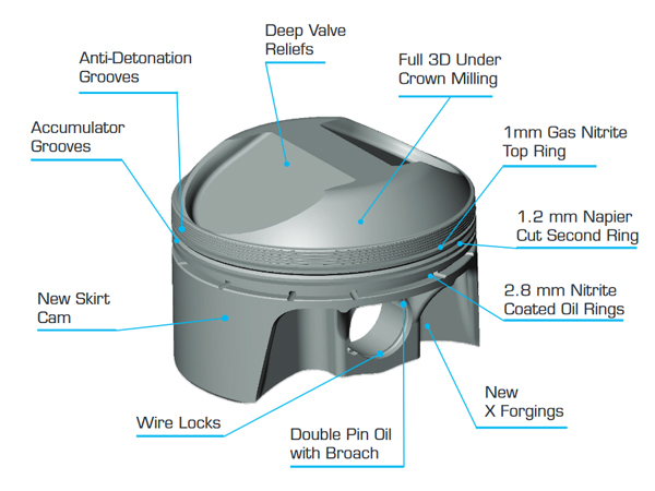 活塞由 2618 合金制成,采用窄销毂锻造,并配有重型销以增加强度。活塞包括全 3-D 冠下铣削,通常仅在定制活塞上发现,以确保最轻的活塞。每个活塞都具有防爆槽、蓄能器槽、带拉刀的双销油、带安装工具的线材 lox 系统和一组 CPN 环,包括带纳皮尔切割第二环的气体氮化物顶环。