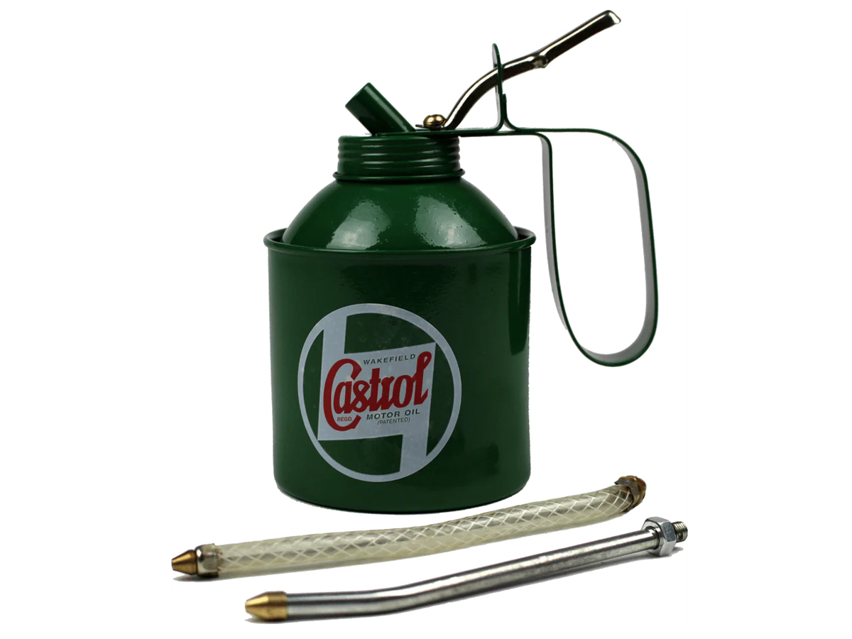 The classic Castrol oil applicator. Pump action screw top cans supplied with exchangeable fixed and flexible applicators.