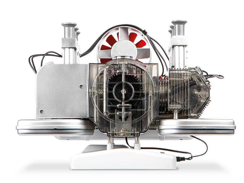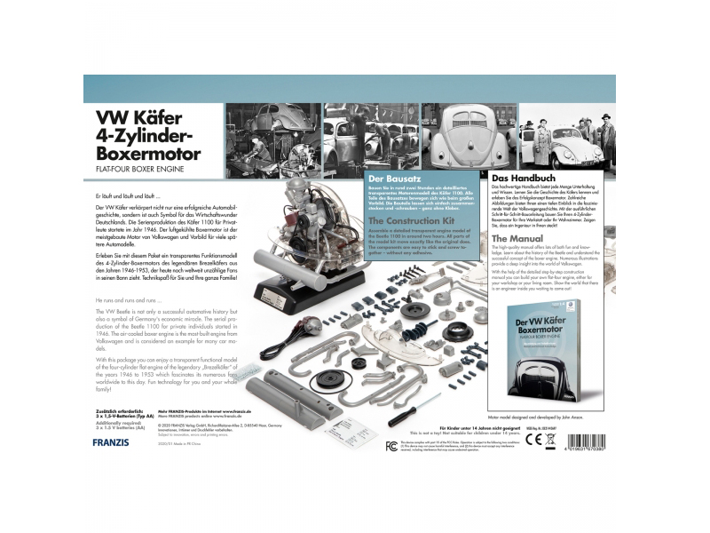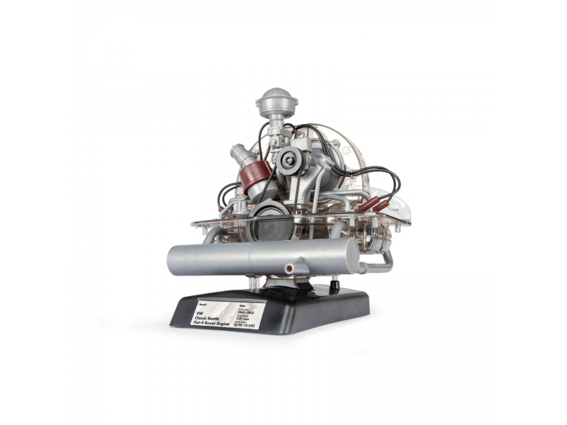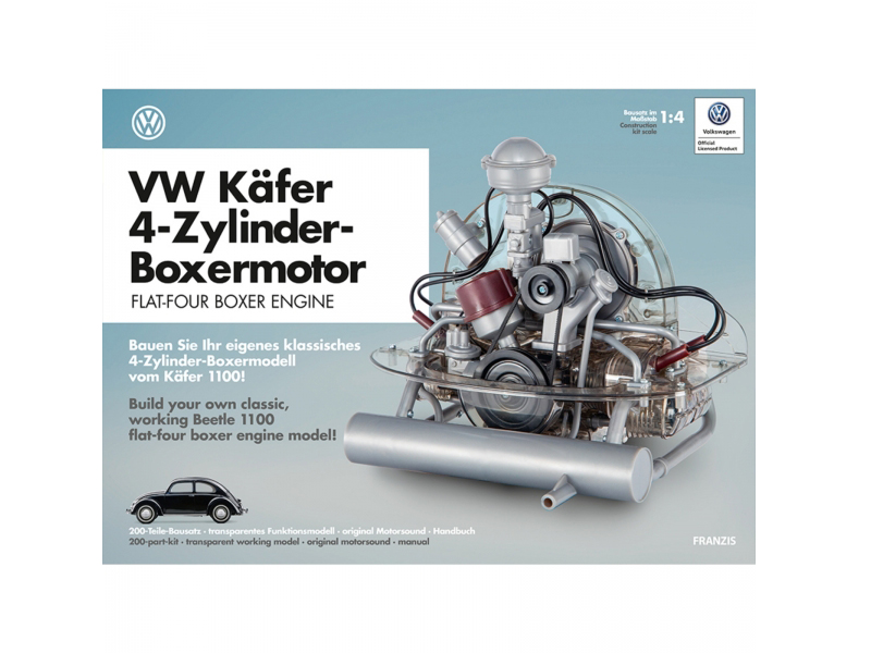 Get a transparent functional model of a 4-cylinder boxer engine of the legendary pretzel beetle from 1949-1953, which still enchants countless fans worldwide. Technical fun for you and your whole family! With this package you can build a transparent functional model (scale 1: 4) of the legendary Beetle engine out of 200 parts in about 3 hours. All parts move like the big prototype: crankshaft, pistons, valves. With sound module. The components can be easily plugged and screwed together - without any glue.