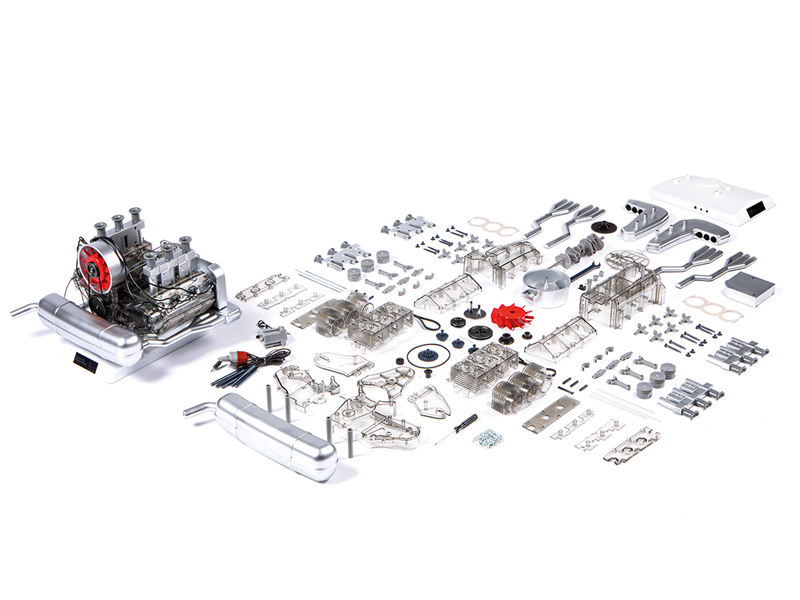 The approximately 200 parts can be built in around three to four hours to form a functional boxer engine for your desk.