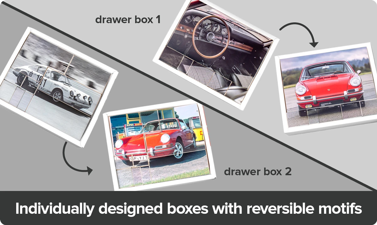 24 个精美的可翻转盒子由环保纸板制成,内含您打造个性化保时捷体验世界所需的所有组件。这些可翻转盒子的正反两面均印有经典的大幅工厂照片。只需将空盒子翻转过来,即可拥有一个全新的设计。