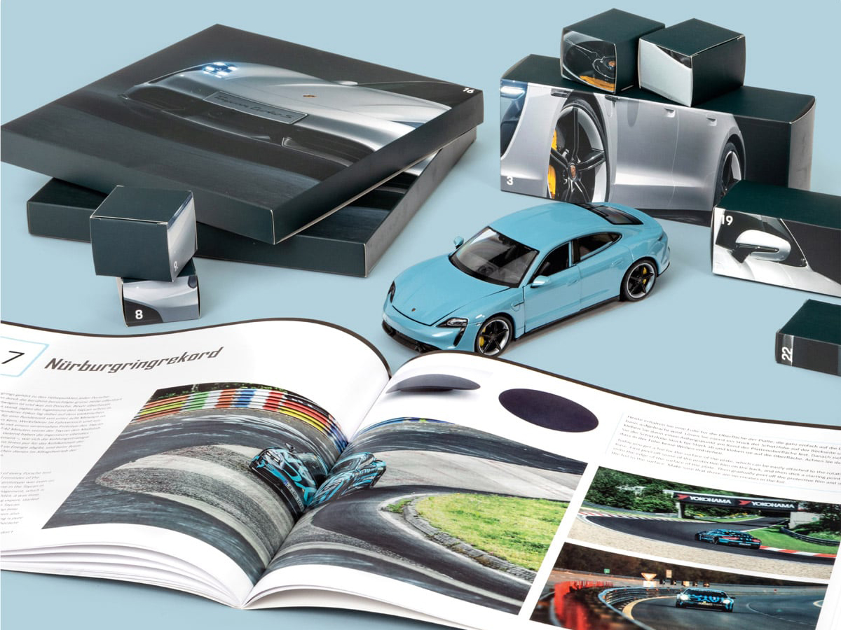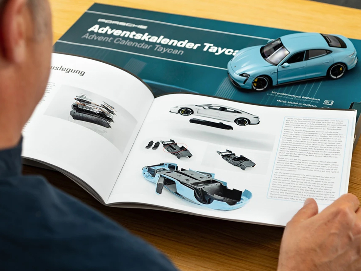 配套手册详细介绍了保时捷 Taycan 的开发历史和技术规格。它还提供了这款由 11 件零件组成的模型车以及所有其他降临节日历内容的全面组装说明。这确保了轻松有趣的拼搭体验,并配有大量令人回味的图像!