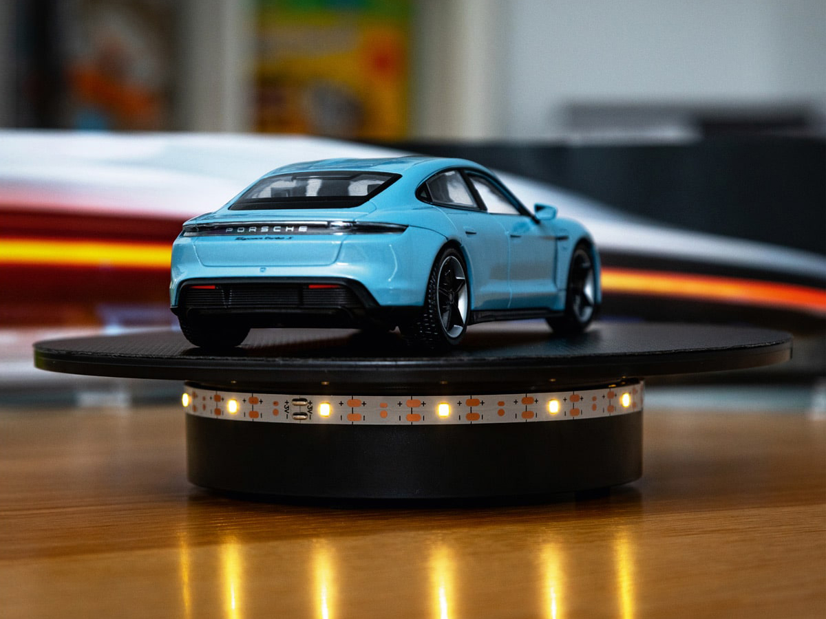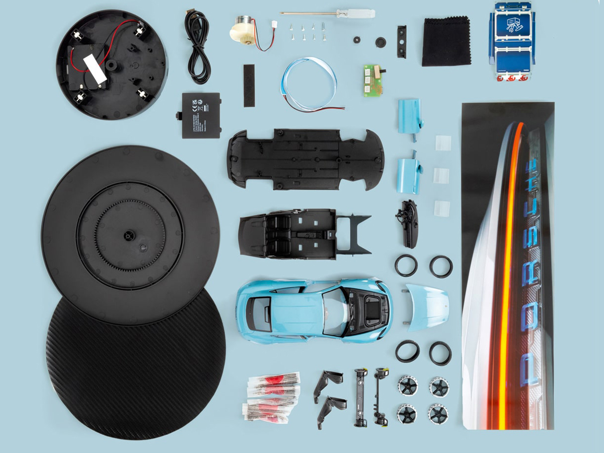 对于所有保时捷 Taycan 的忠实粉丝来说,这绝对是“全方位无忧套装”!它包含模型零件、旋转底座、所有必要的电子元件、装饰元素以及配套手册。单个模型和电子元件的高品质制造确保了其长期可靠的功能。
