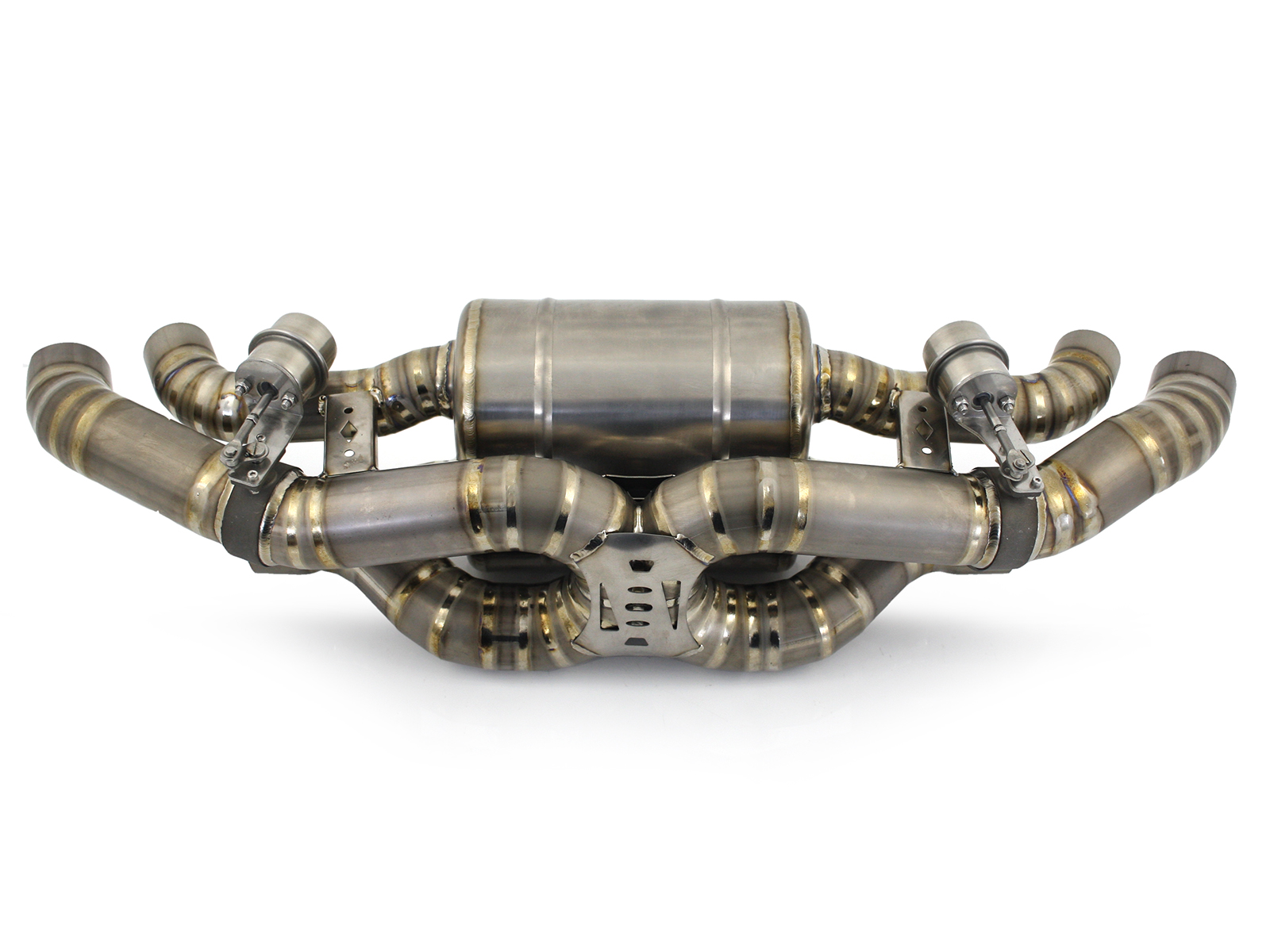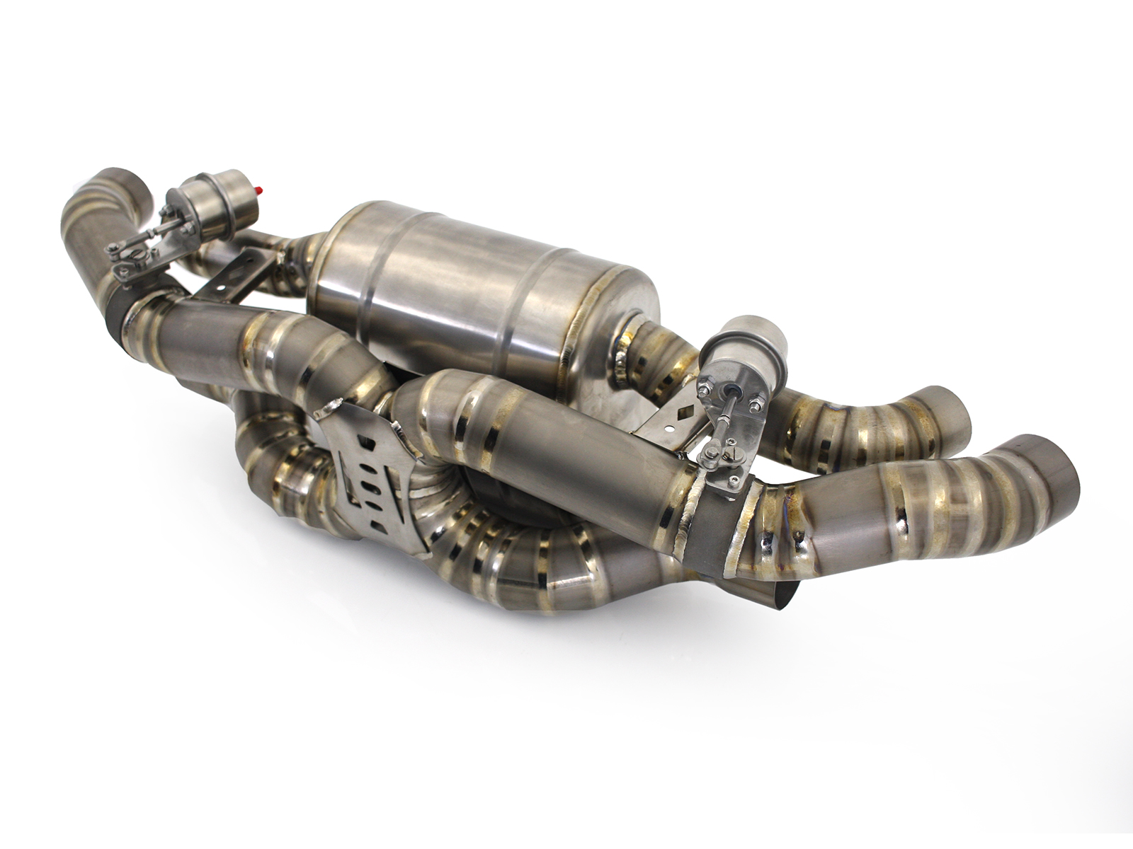保时捷 991.1 的高品质钛合金排气系统。歧管后排气管包含催化转换器旁通管和排气管。保时捷991.1 S 3.8L