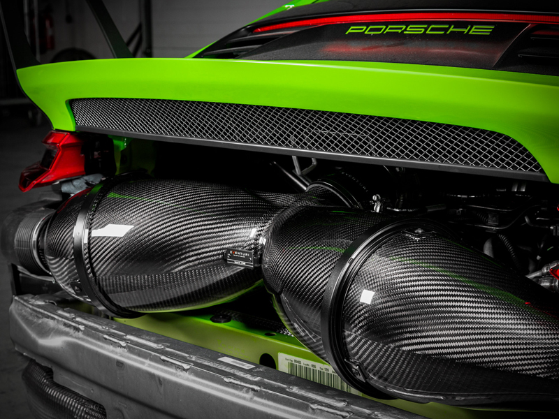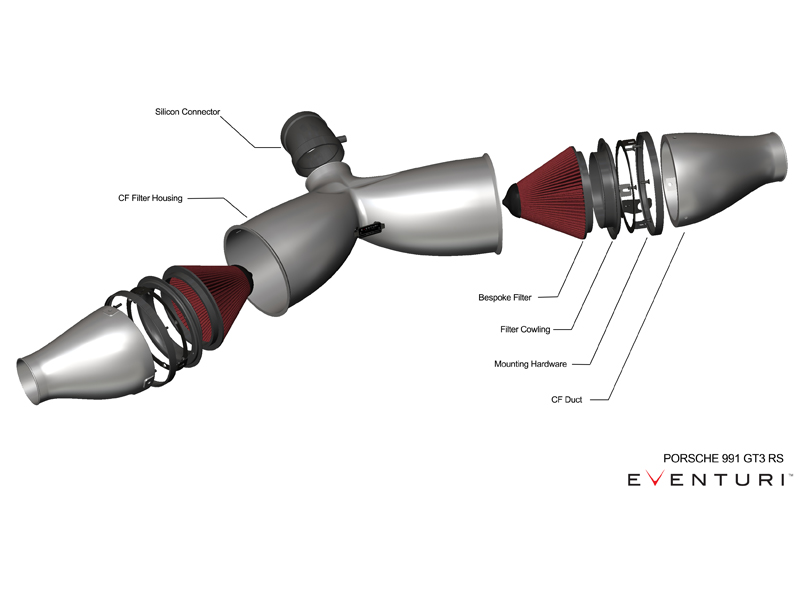 The Eventuri 991 GT3 RS intake system consists of a number of components engineered to perform a specific purpose and fabricated to the highest of standards. We use 100% pre-preg carbon fiber with no fibreglass which means we can achieve a smooth internal surface to maintain smoother airflow. Here are the details for each component and the design ethos behind them: