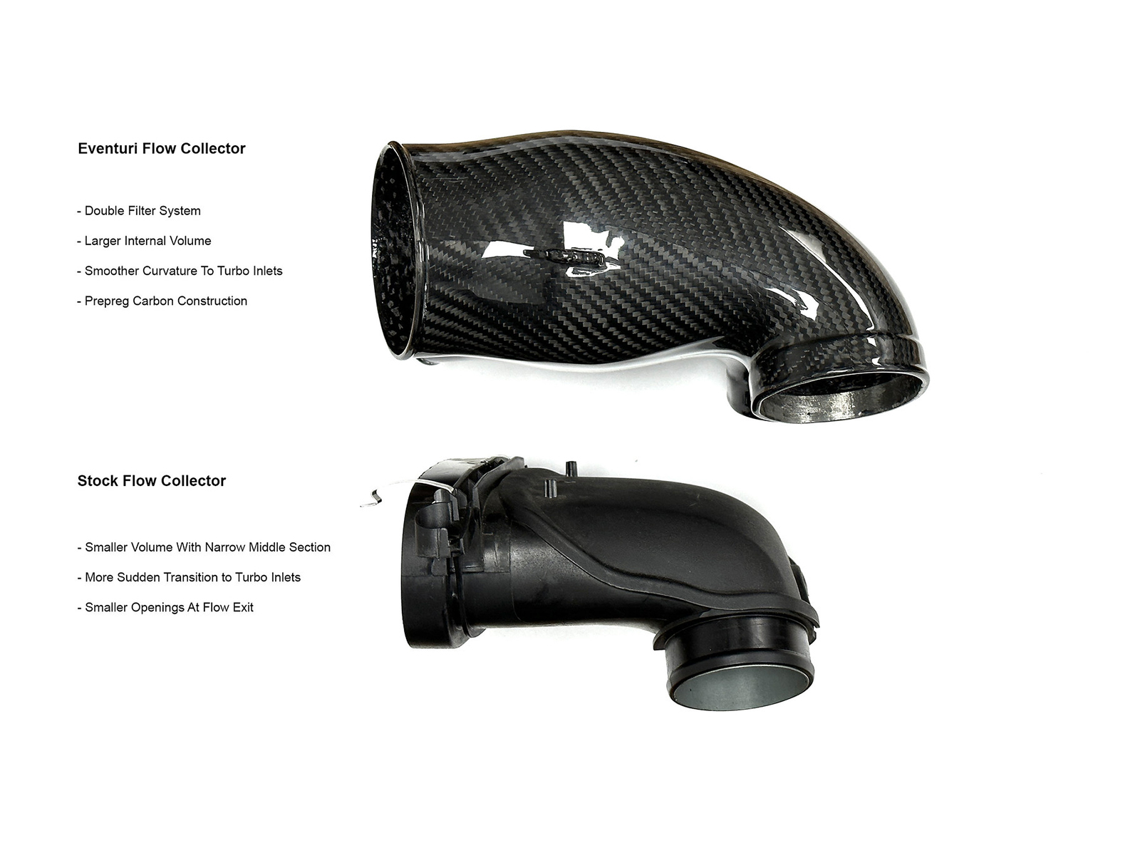 Eventuri 4.0TFSI V8 进气系统由多个组件组成,这些组件专为特定目的而设计,并按照最高标准制造。我们使用 100% 预浸碳纤维,不含玻璃纤维,这意味着我们可以实现光滑的内部表面以保持更顺畅的气流。以下是每个组件的详细信息及其背后的设计理念: