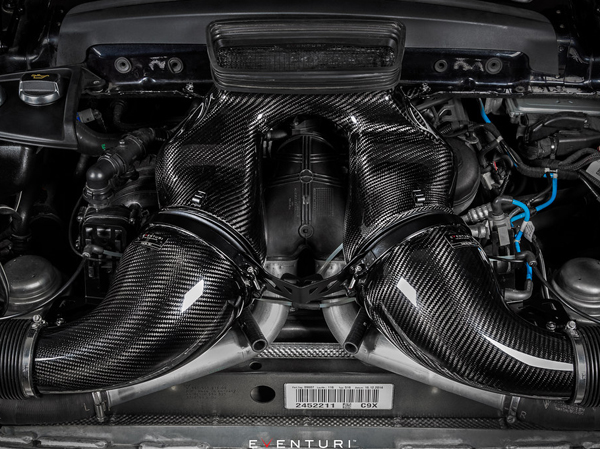 991 Turbo Eventuri 进气系统是通过大量实际测试开发的,旨在使涡轮增压器更高效地工作。通过用单独的专利文丘里过滤器外壳替换单个原装空气箱,涡轮增压器能够以更小的阻力旋转并产生增压。因此,废气门占空比降低,从而在较低转速下产生峰值增压,因此性能提高。与单个原装面板过滤器相比,两个单独的过滤器提供了更大的过滤面积。此外,为了降低进气温度,文丘里外壳密封在空气管道上,该空气管道从与原装系统相同的位置吸入环境空气。由于 911 Turbo 发动机舱非常密集,因此只有确保进气系统完全密封才能避免高 IAT。每个涡轮增压器的更平滑气流路径与低 IAT 相结合,可实现比原装空气箱更高的性能和更灵敏的油门响应。