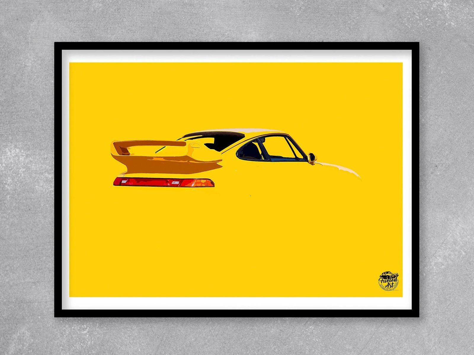 黑色边框保时捷 911 993 GT2 RS 海报沉浸在保时捷 993 911 GT2 RS 的惊人外观中,Fueled.art 的这幅 Racing Yellow 艺术版画完美地捕捉了它。这件独特的作品采用了大胆的艺术手法,汽车的鲜艳黄色与背景无缝融合,营造出流畅的高能量效果,增强了汽车的激进姿态和空气动力学设计。