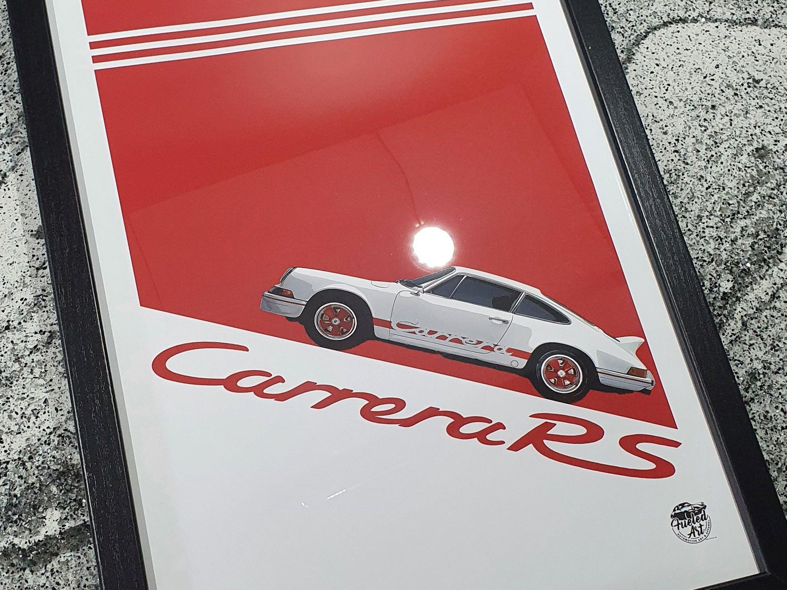 黑色边框保时捷 911 Carrera 2.7 RS 海报用这幅由 Fueled.art 创作的令人惊叹的保时捷 2.7 Carrera RS 艺术版画来庆祝保时捷历史上最具标志性的 911 之一。Carrera RS 以其轻量化设计、标志性的鸭尾扰流板和令人振奋的性能而闻名,是经典跑车界的真正传奇。这幅艺术作品捕捉了 Carrera RS 永恒的轮廓和激进的姿态,以 Fueled.art 标志性的艺术风格将其赛车血统栩栩如生地展现出来。