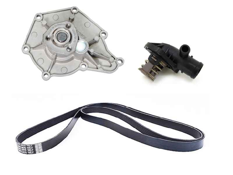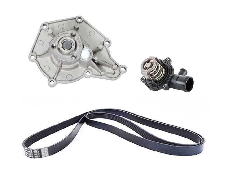 这套完整的水泵套件包括一个新的水泵、恒温器、驱动(蛇形)皮带以及水泵和恒温器壳体所需的垫片。
