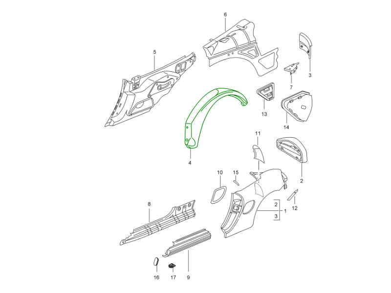 - 作为车身贴合面板,它有助于保持结构完整性(内轮罩通常与后侧结构相连),并在更换或修理轮拱、侧围板或后保险杠时确保面板的精确对齐和面板间隙。