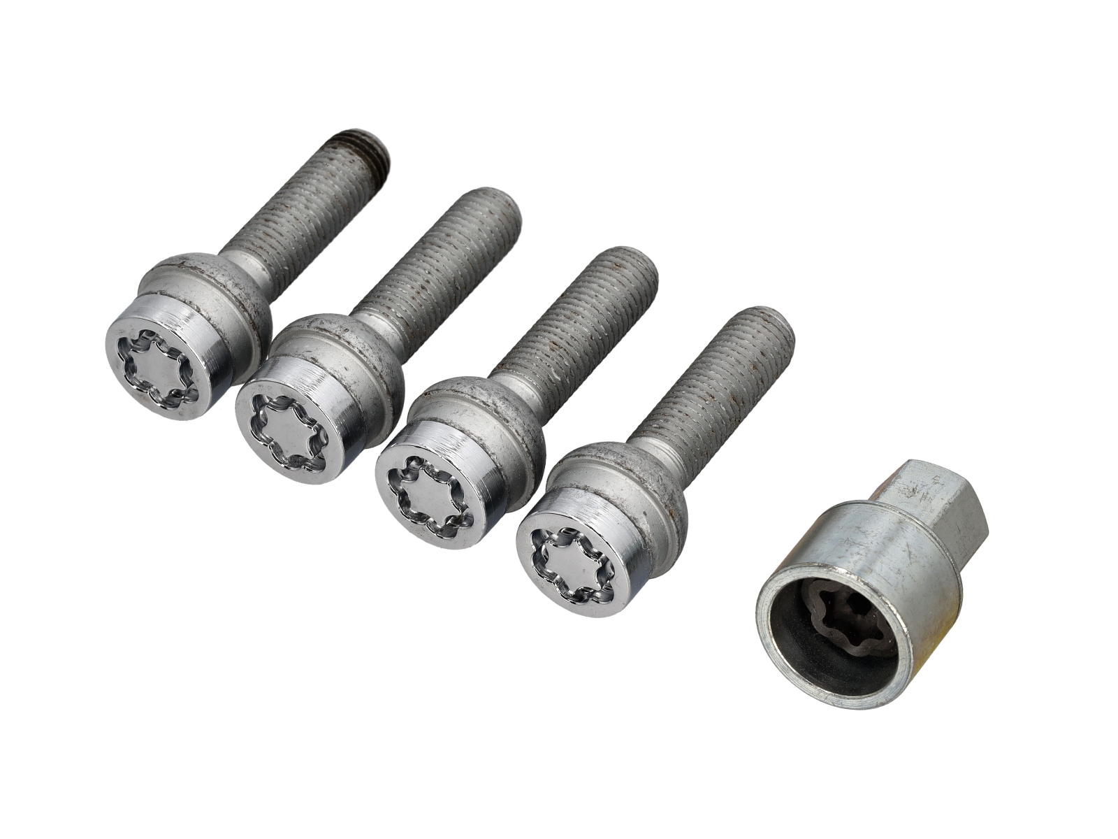 McGard 镀铬螺栓式半径座椅锁螺栓套装(M12 x 1.5 螺纹尺寸)。4 把锁和 1 把钥匙规格: