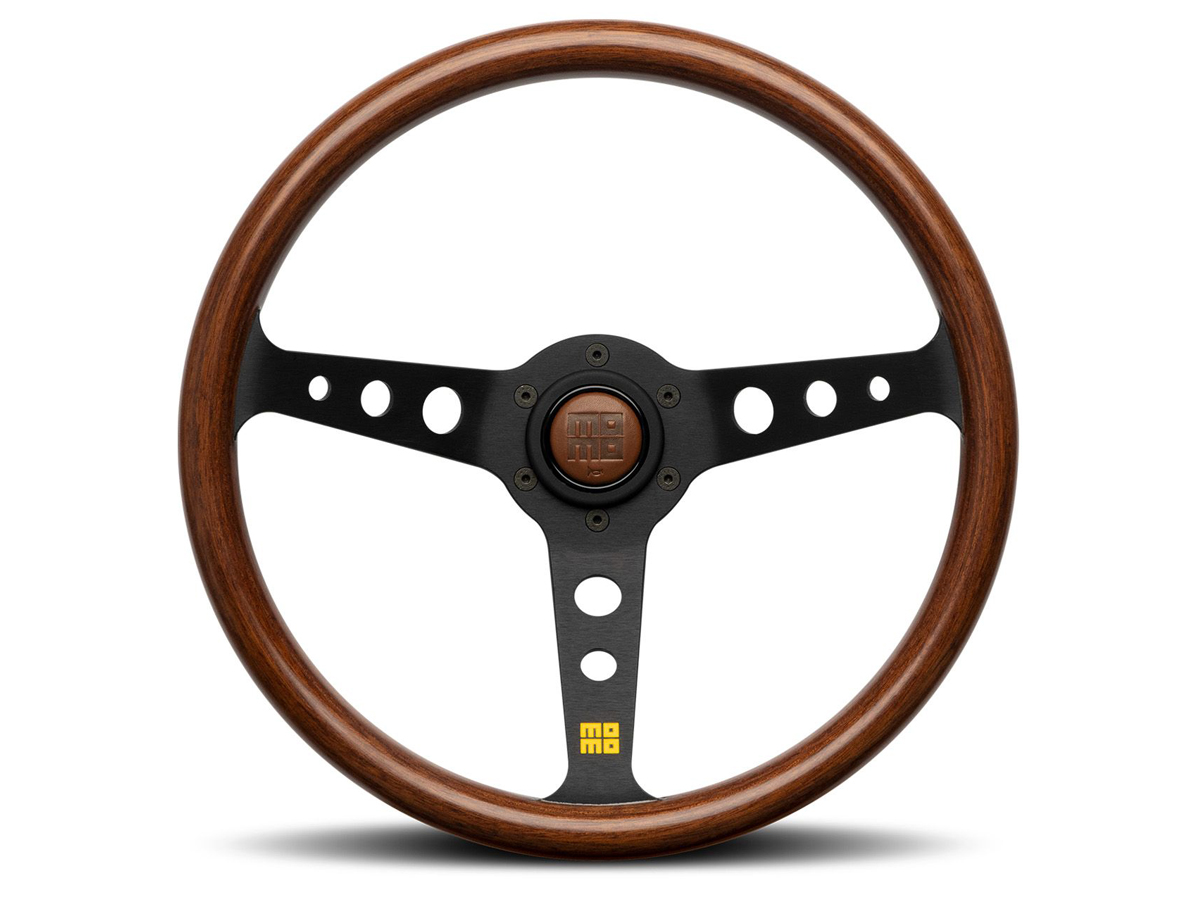 The MOMO MOD.07 Heritage steering wheel is produced from the finest premium Italian mahogany wood and features black cut-out aluminium spokes, with the stacked MOMO heritage logo CNC engraved and hand enamelled in yellow on the lower spoke.
