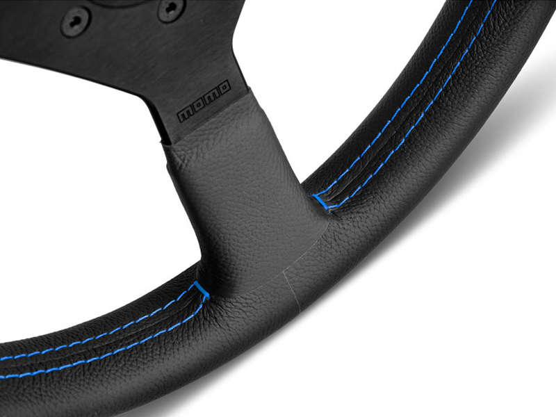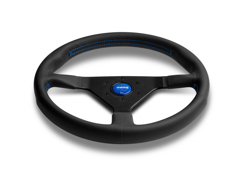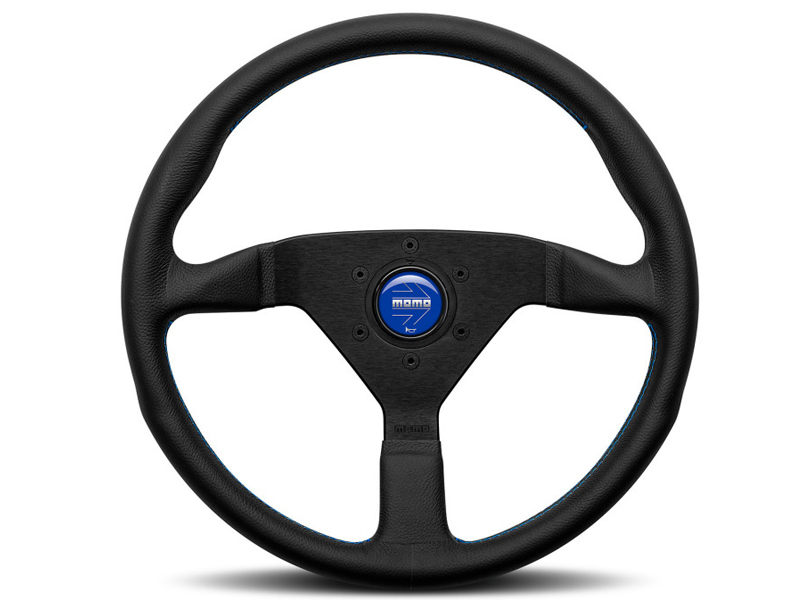 The MOMO Montecarlo Blueis produced from top grain black leather, featuring a generous anatomic grip, black spokes, blue stitch and a blue MOMO Arrow horn button, the Montecarlo offers a simplistic design that is perfect for the aftermarket customer.