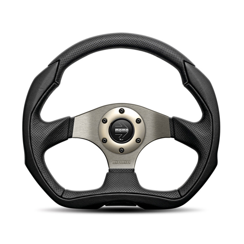 Featuring black aluminium spokes, genuine leather inserts, sculpted grip and black MOMO Arrow horn button, the Quark provides true value for money.