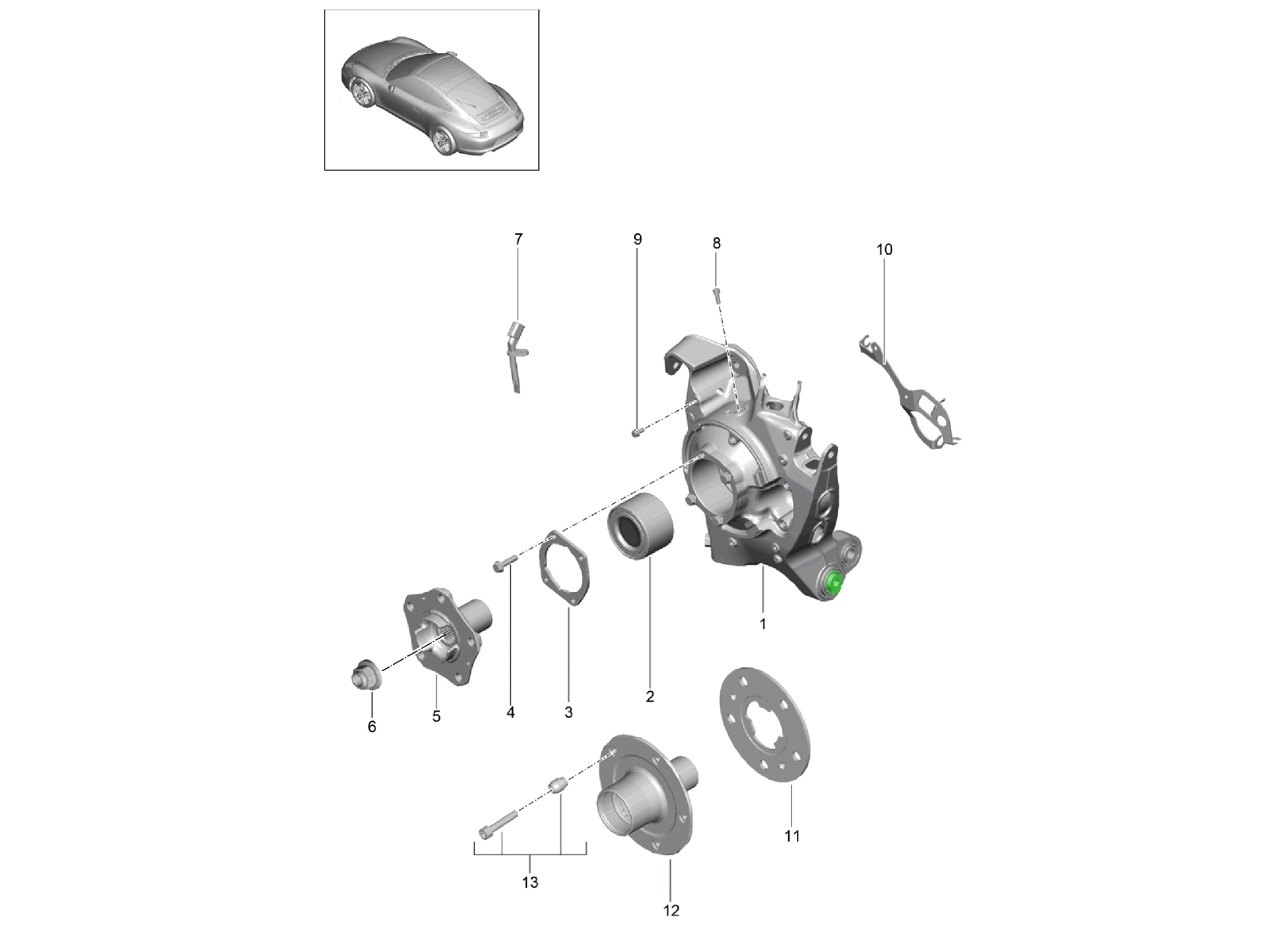 These bushes are part of the rear wheel hub / rear wheel carrier assembly – OE reference numbers: 99133111103 (-104/-105) and 99133111203 (-204/-205).