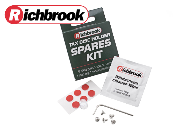 Richbrook Tax Disc Holder Spares kitIt includes 8 sticky pads, 1 spacer, 1 allen key, 2 hex screws and 1 glass cleaner wipe. In fact everything you need to re-fit into your next car.
