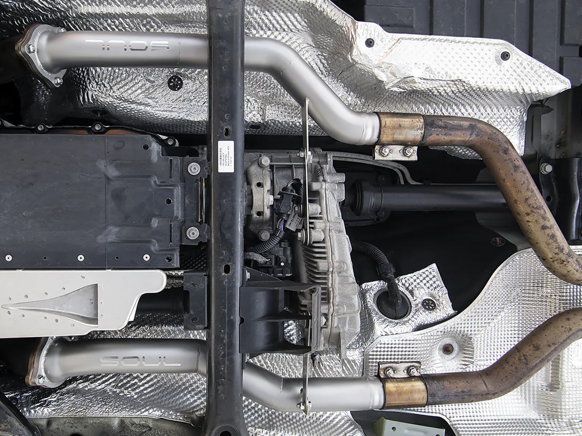 前部管道通过重型Mikalor 带夹连接到定制的 SOUL 变速箱安装支架(专为手动和 PDK 车型设计) 。附加的橡胶减震器支撑着轴上管道,最大限度地减少了整个系统因弯曲和振动而产生的应力,确保在极端使用条件下的长期耐用性。