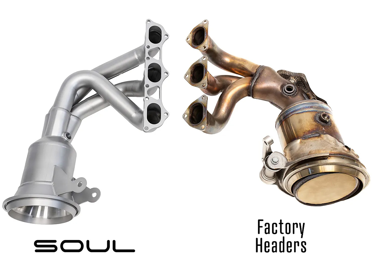 SOUL 竞赛排气歧管消除了这些限制。通过以流畅、性能优化的设计取代集成催化转化器和颗粒过滤器的原厂排气歧管组件,这些排气歧管显著改善了排气流量、油门响应以及 4.0 升水平对置六缸发动机的整体动力输出。
