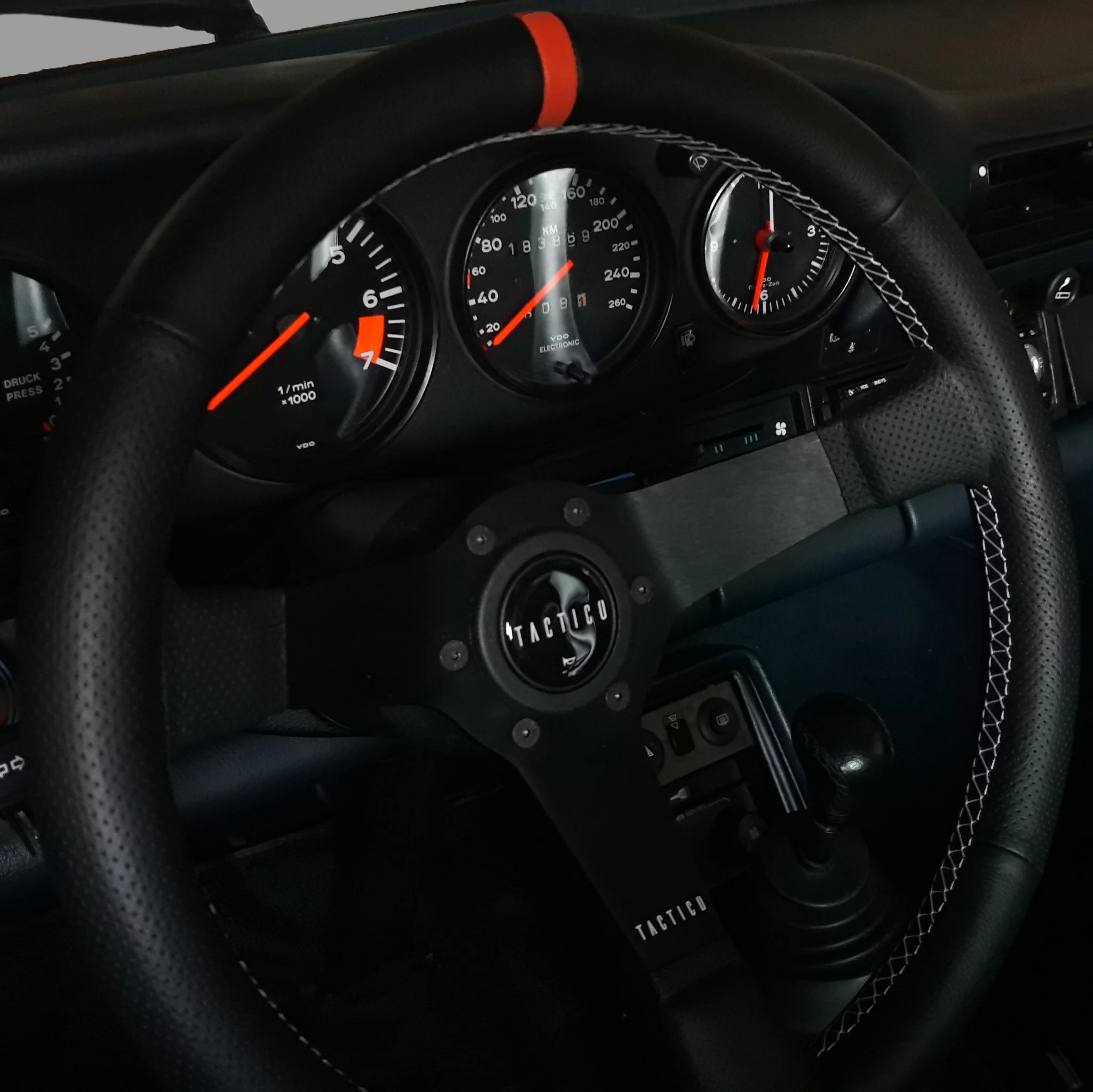 设计时考虑到了 F 系列和 G 系列的 911,其颜色与汽车内饰完美融合。白色缝线与仪表内的数字和指示器颜色相匹配。此方向盘还配有橙色指示器。