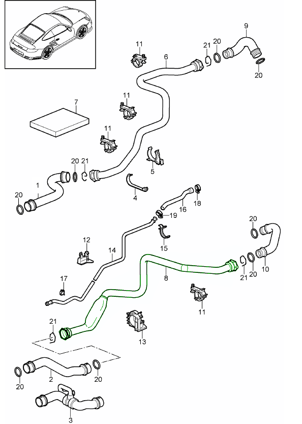 冷却液软管 - 连接至加热器控制阀(发动机舱)。保时捷 981 Boxster & Cayman 包括 Spyder & GT4 2012-2016 - 9A110661731