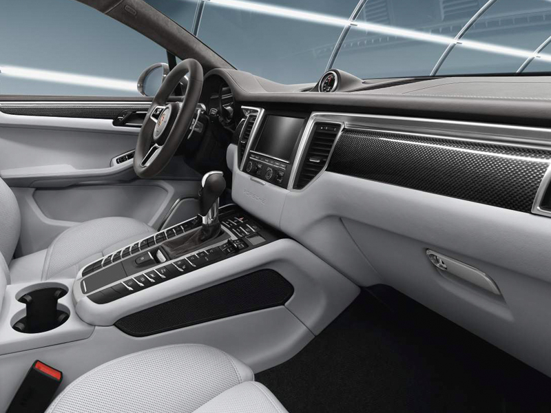 碳纤维内饰套件。碳纤维饰面:变速杆或 PDK 选档杆和仪表板装饰条。变速杆或 PDK 选档杆采用黑色皮革饰面。