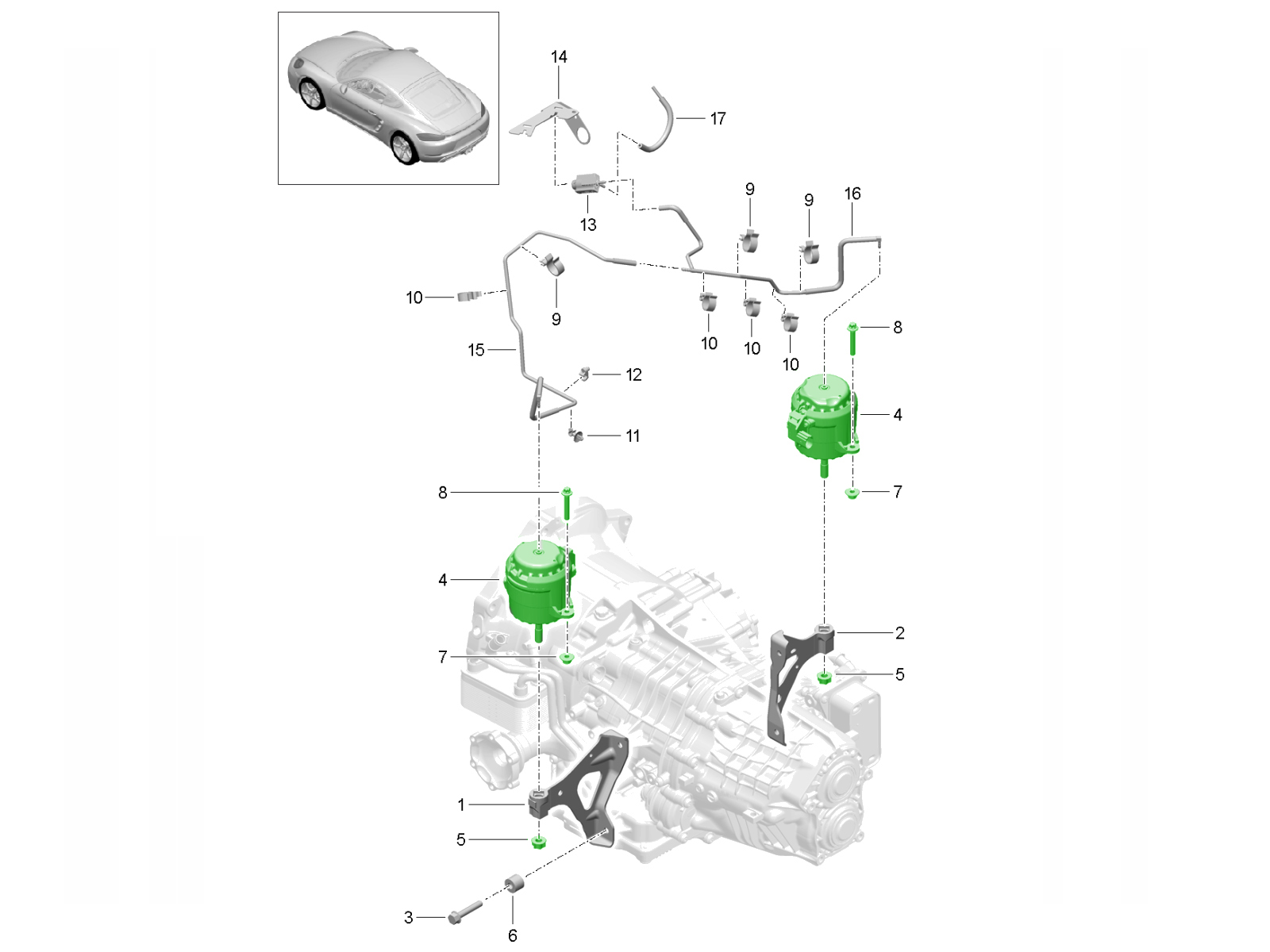As genuine Porsche components, the mounts and hardware are engineered to factory standards for precise fitment, vibration isolation, and dynamic drivetrain control, ensuring the powertrain remains correctly supported while maintaining the performance characteristics Porsche intended.