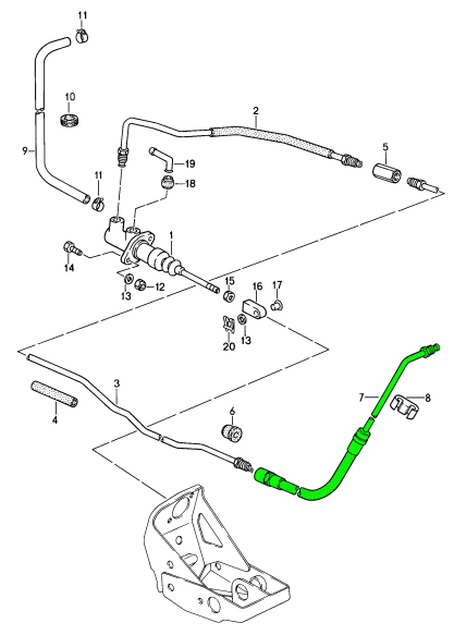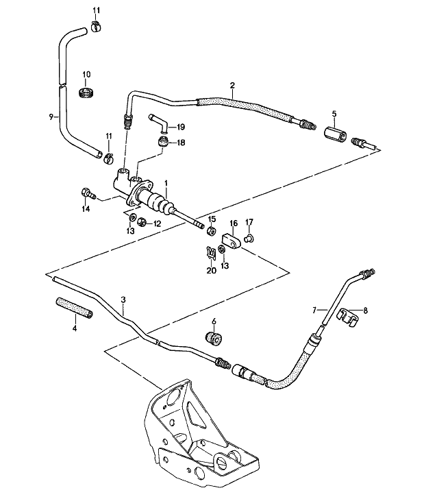 A clutch that is engaged/disengaged via hydraulic fluid instead of a cable uses a Clutch Master and Clutch Slave Cylinder. When depressing the clutch pedal a lever is squeezed, forcing hydraulic fluid through hydraulic lines to a "slave cylinder" which houses a piston. The piston forces a push rod to engage or disengage the clutch. A clutch master cylinder that contains the hydraulic fluid sits on a support har near the clutch lever. When either the Master or Slave Cylinder fail the clutch is unable to be disengaged.