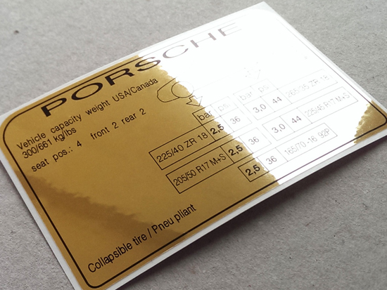 • 正宗保时捷轮胎贴花和压力信息标签。