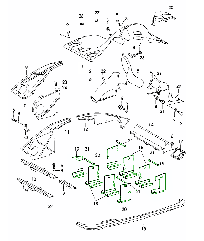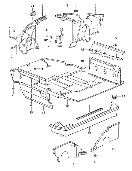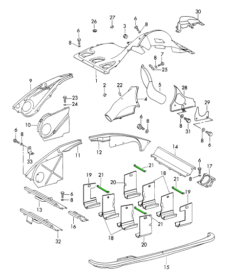 - 图示为1989款911 3.2L车型。位置和数量会因车型不同略有不同。