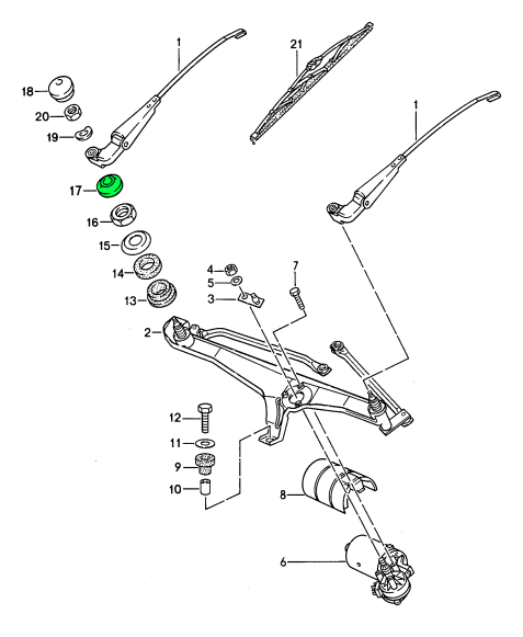 该套件包含雨刷臂底部与曲柄机构连接的 2 个橡胶衬套。更换雨刷臂时,它们必不可少。